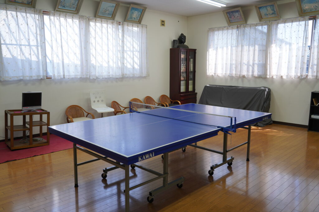 徳蔵寺では、本堂や行事だけでなく、「ピンポン(卓球)」を通して人と人との心を交わす取り組みを大切にしています。地域交流と人材育成の一環として、境内に卓球場を設け、地域の皆様や学生の方々に広く開放してまいりました。